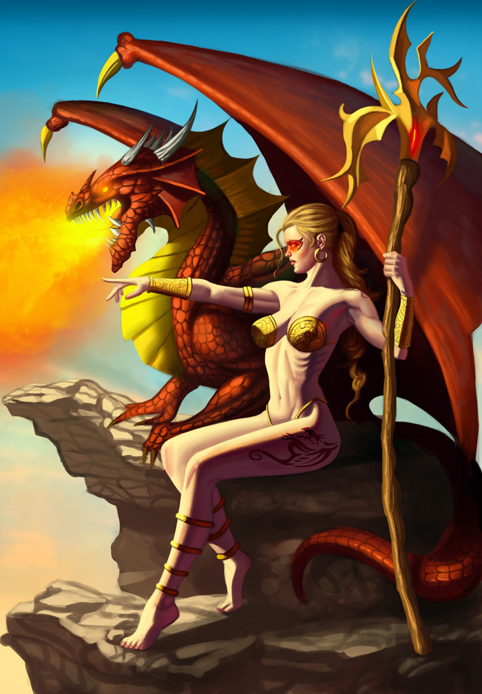 * I would choose a warmer yellow for the dragon, especially where the light from the fire hits it. The current fairly cool yellow looks lit with a white light, not firelight.