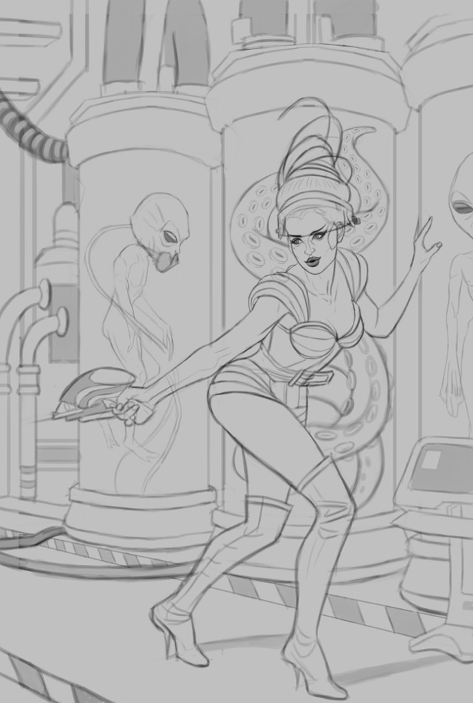 I began work on a new sketch, this time with a Sci-Fi theme. I was inspired by a www.deviantart.com/s-t-a-r-gazer/art/Sto...Art-6-746868754stock photo I found on DeviantArt, really digged the pose and design of the costume on the figure, so I did my best to recreate it. I tried to do something more original with the expression and especially the background to make it more interesting. Overall I'm very happy with the sketch, although I'd like to hear some input before beginning the painting process, so please feel free to offer any input! Here is the sketch: