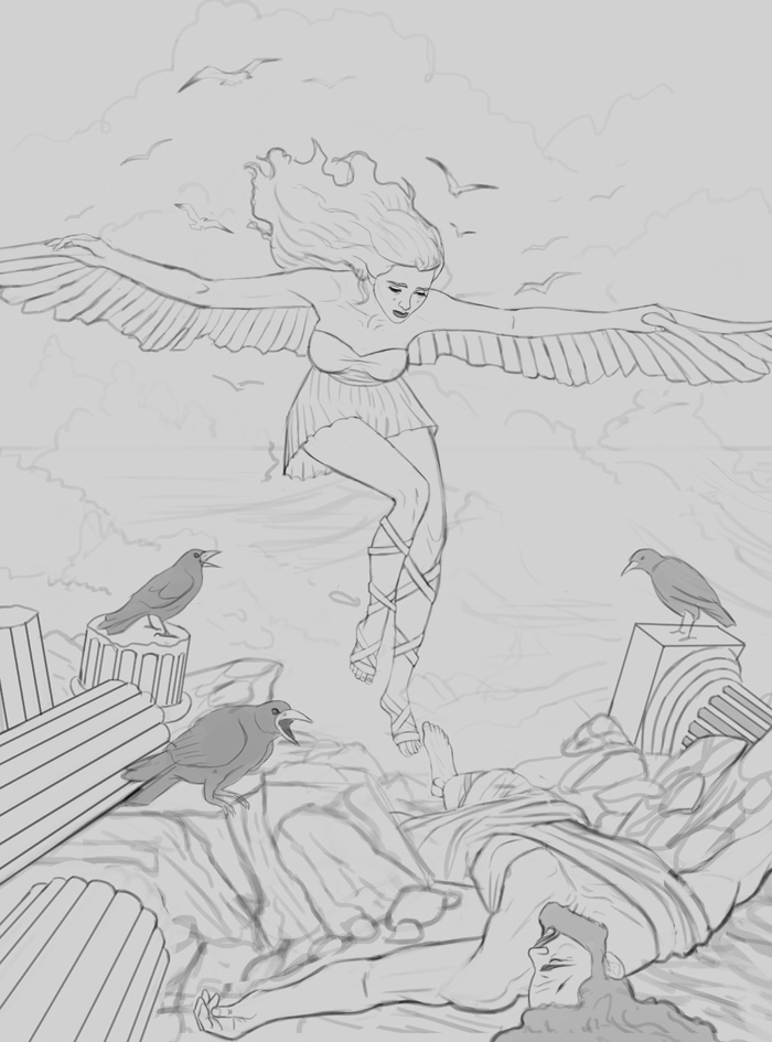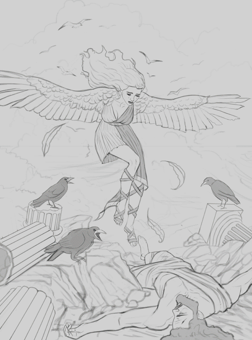 I started on a new illustration, the story of Ceyx and Alcyone which is one of my favorite tales from Greek Mythology. I remember reading this story as a child and was highly inspired, so I thought it would make for a fun painting. Here is the line art, any input would be especially helpful before I begin painting!