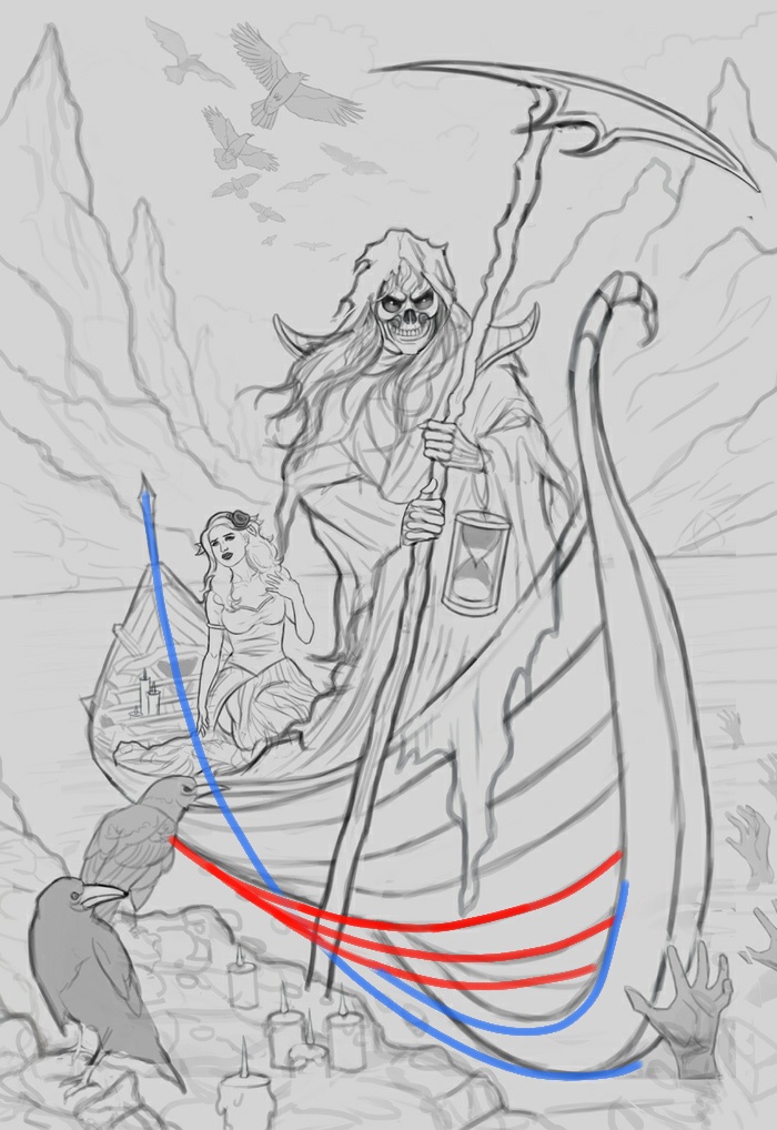 And maybe we should see some more creepy hands on the left side of the boat too? Like one or two to the left of the uppermost raven. (And now I realise the boat doesn't seem to be in the water? Which could be cool, but if that's the intention perhaps there needs to be a bit more distance between boat bottom and water surface to make it evident it's intentional?)