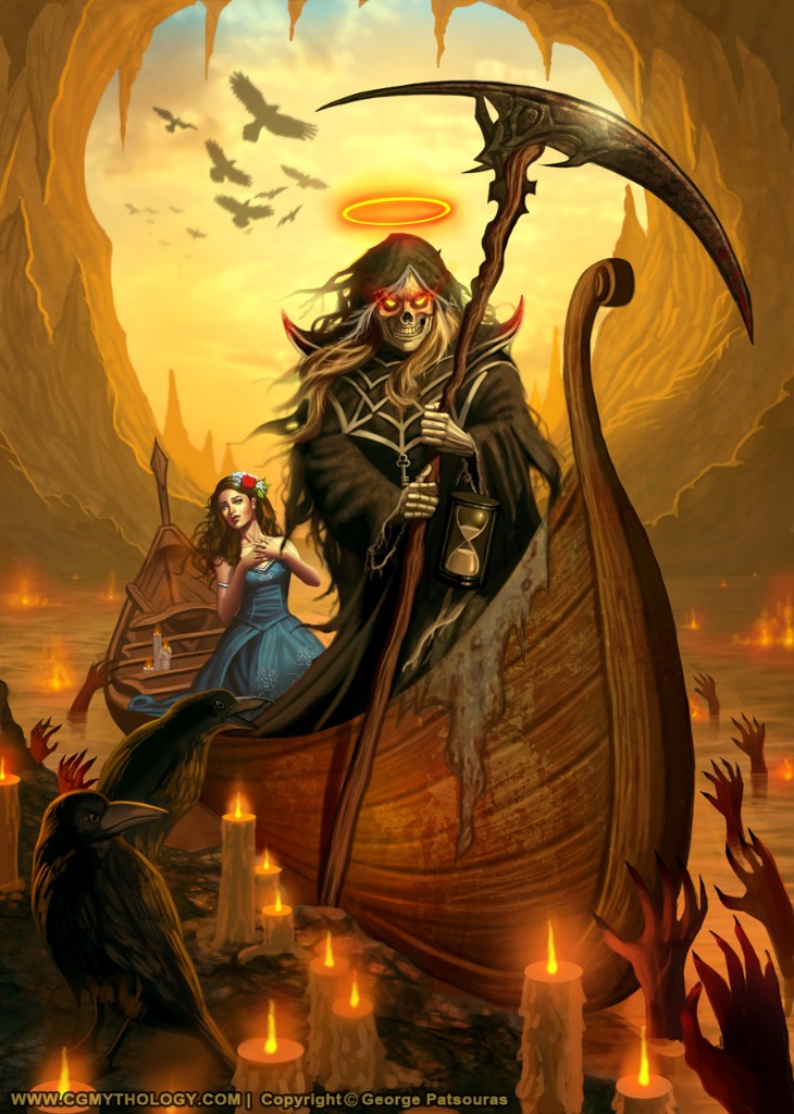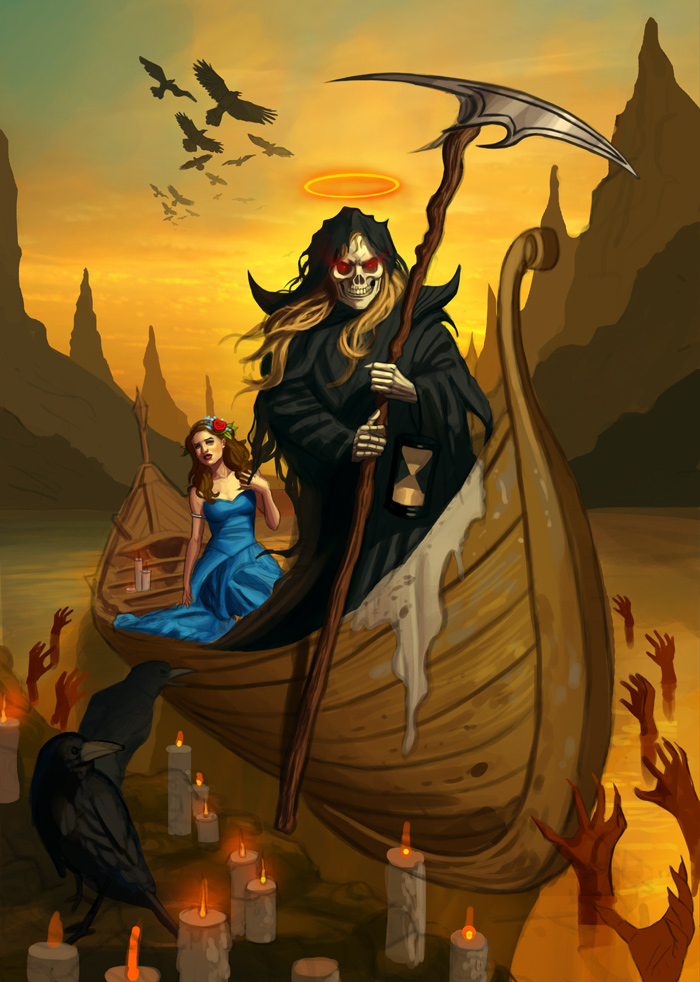 I like the way he dominates the scene and the way that his grip and the diagonal of the scythe breaks the symmetry of his pose.
