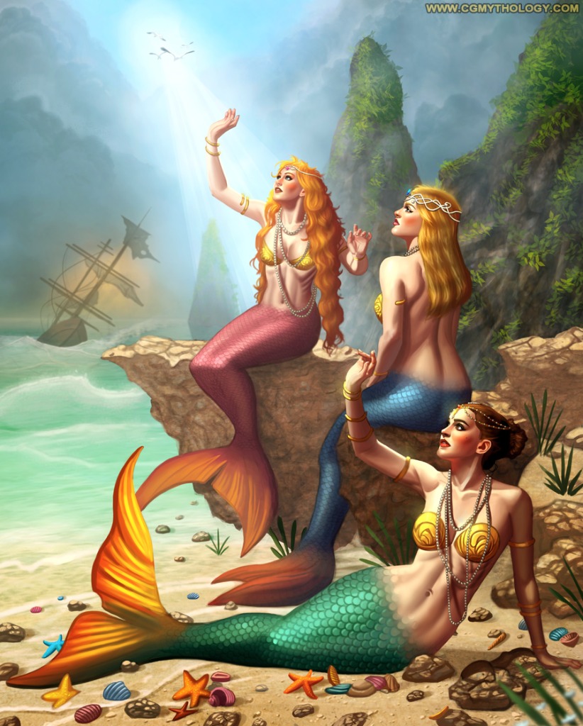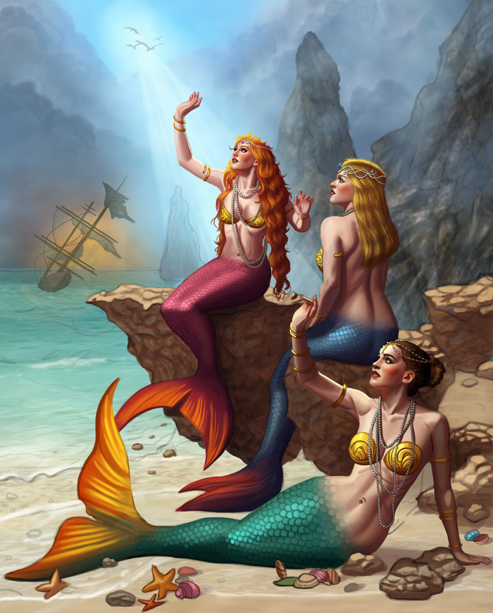 2) There's a tangent (or very close to a tangent) between the lowermost mermaid's face and the next mermaid's bum. If possible, I think a greater overlap would look better.