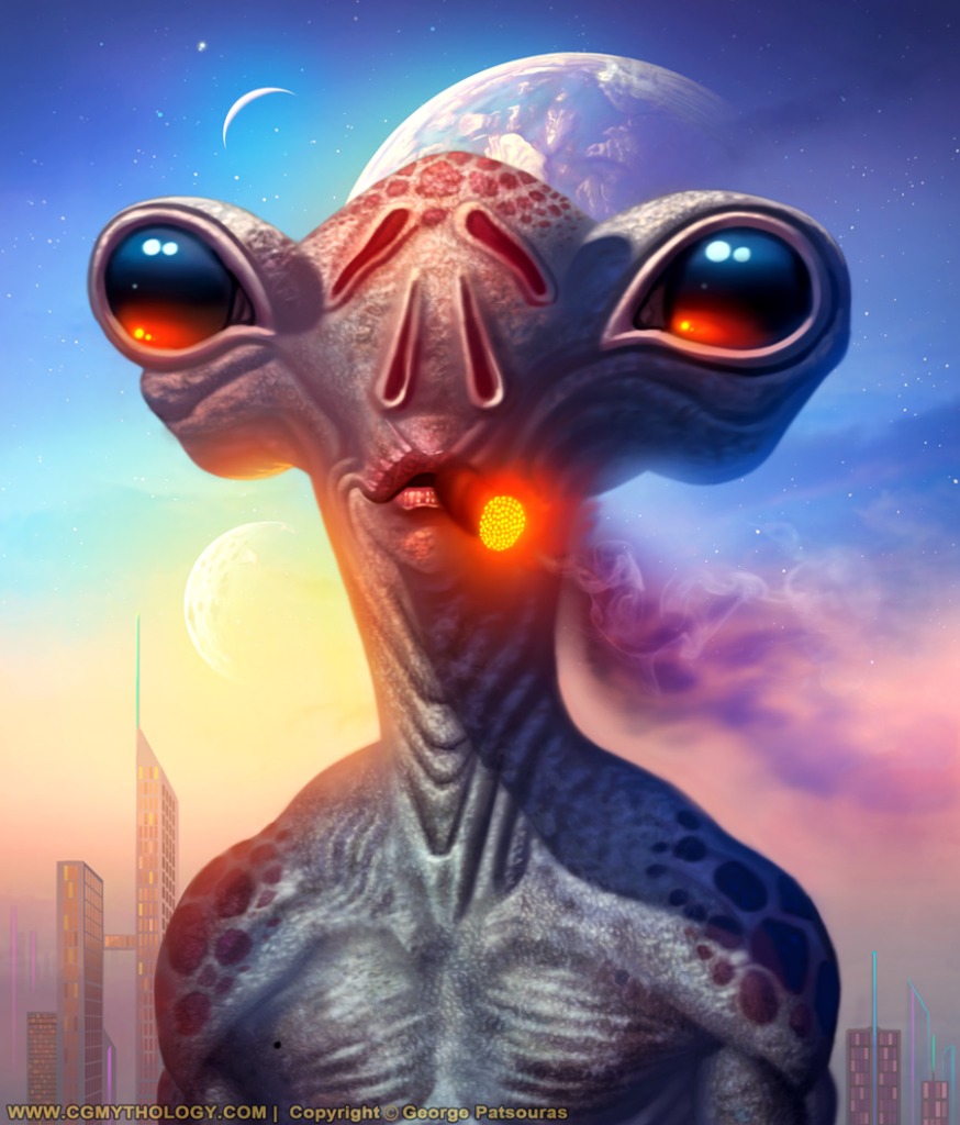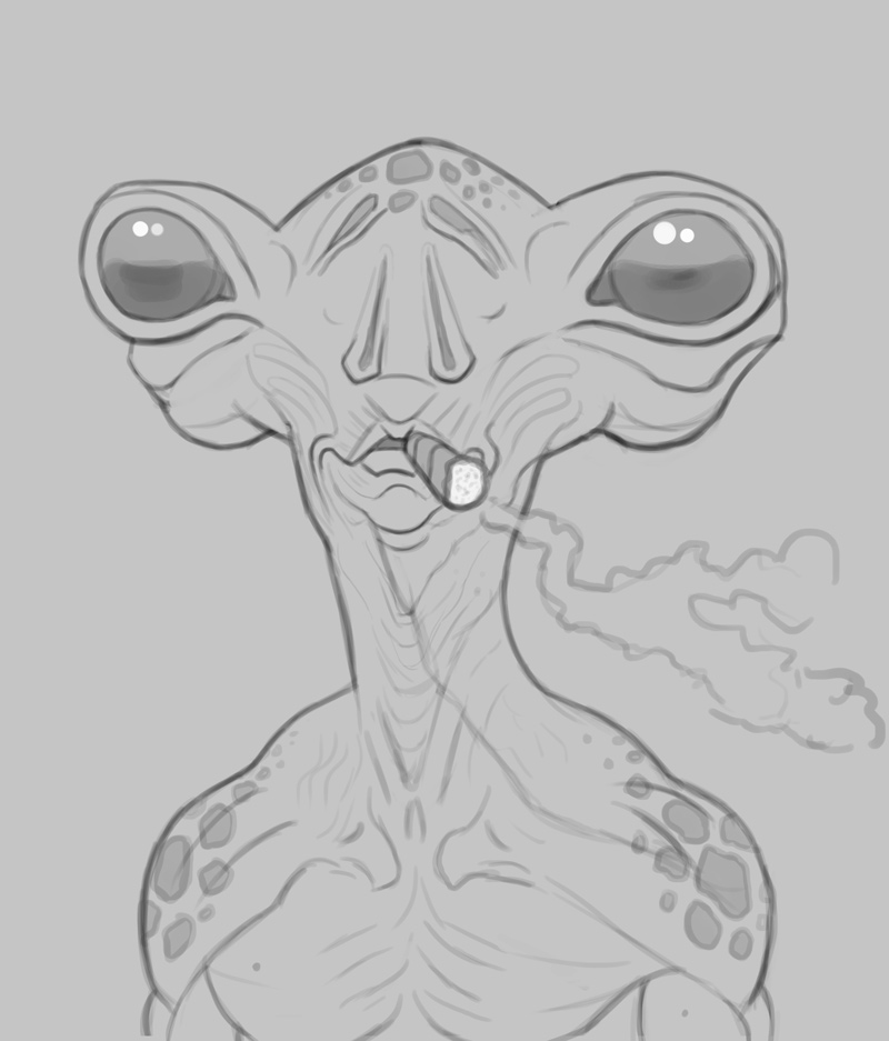 Charlotte: Thank you! Great suggestion, and although I won't apply clothing to this particular alien, your suggestion did give me an idea of painting an alien in a luxurious attire which I plan on exploring soon. I like him naked in this image as I wanted to show off the skin texturing, and I think it adds to the humor as well!