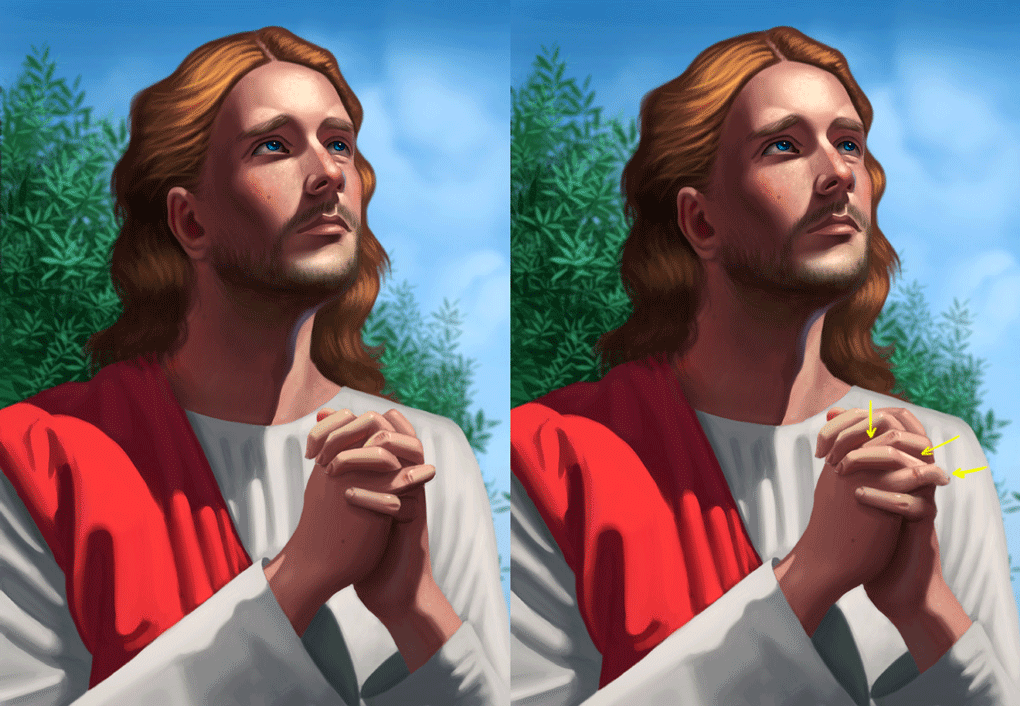NOTE: After posting the side-by-side, I also noticed that you may want to visit his palms. With fingers laced, the palms would pretty much line up, or at least be close. Right now, his left palm appears to be too low in relation to the right.
