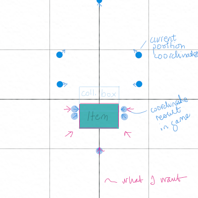 Edit4: Still just trying to get things right for ONE out of nine items. Trying to get my head around what I should go by, but not having any luck. Should the collision box be located according to the coordinate system or the center of the item??? This is the result I am having, so far.... Seems coordinates are scaled somehow for some utterly inexplicable reason. (The reason the collision box and the item doesn't line up currently is because I chose to set it at zero to see what happens. Not that I even know where it ends up when I set it elsewhere since it's invisible and the collision effect itself seem to change randomly anyhow...)
