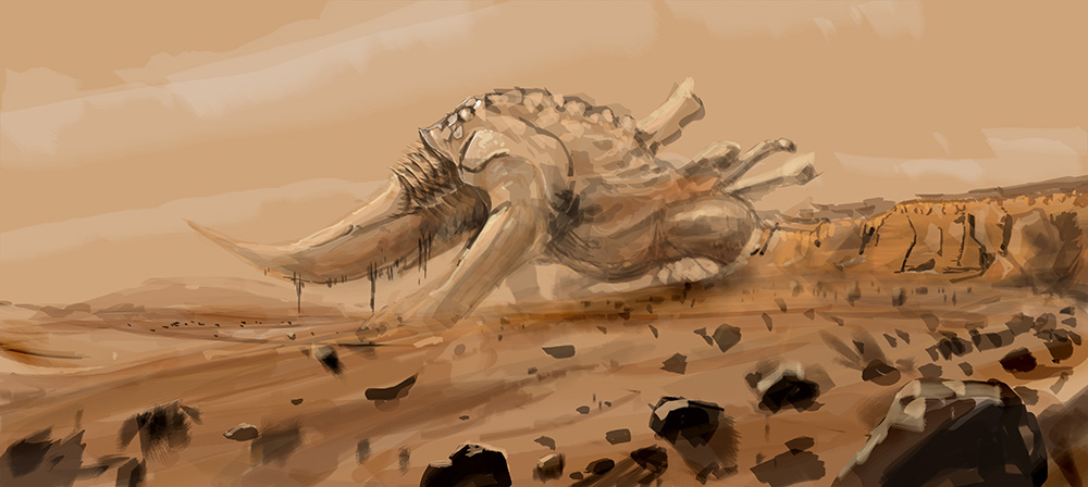 I love the sense of scale in this. That creature looks huge and heavy with such an impressive presence. I can almost feel the ground tremble and hear the bellowing noise it would make.