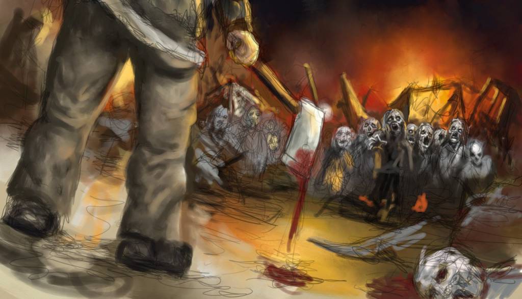 Being a Walking Dead fanboy this brief just made me think of one (terribly unoriginal) thing: the last living human facing off against the horde of zombies! And after seeing other people do it so well in recent challenges, I thought I'd have a go at one of those tilted compositions. (Unoriginal again!)