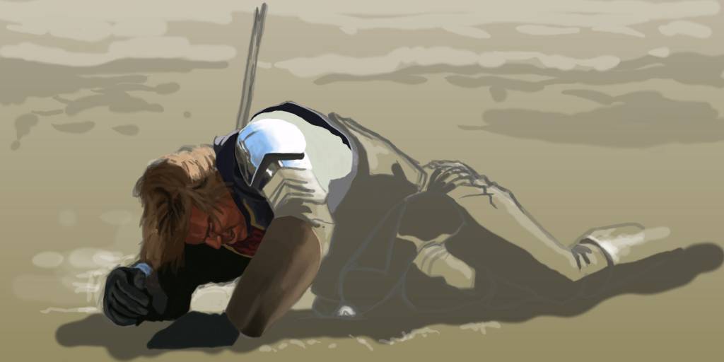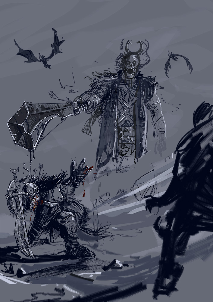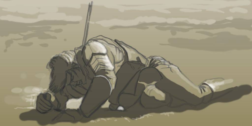 Mine is pretty much what you would expect from me right now. I like the idea of this lone knight on the battle field struggling to rise but feel I'm going to need to add some fantasy element in there at some point - probably in the background as I progress.