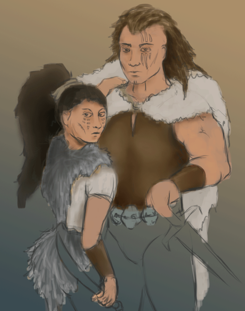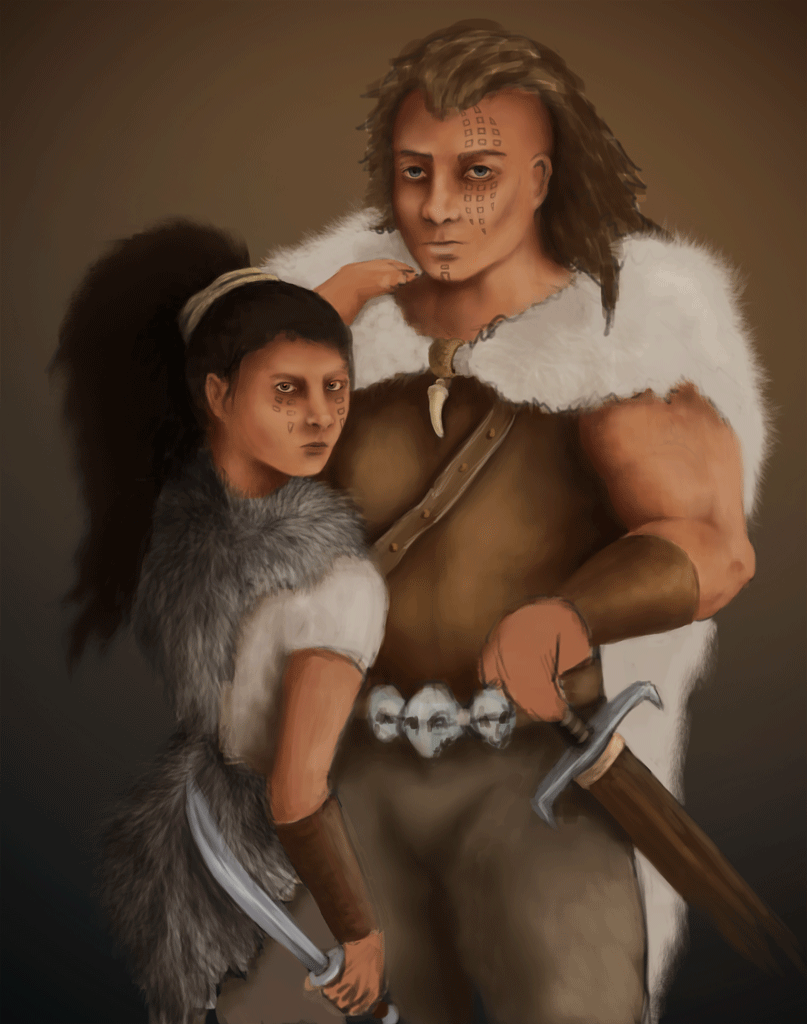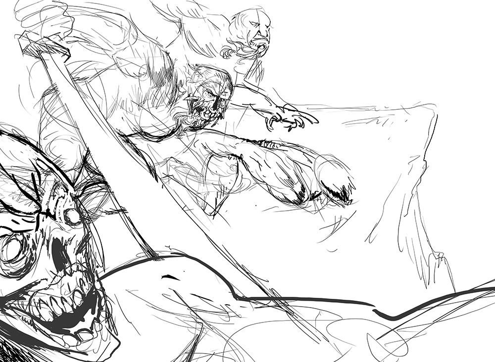 Dave: Nice mood with that colour gradient. The diagonal blend helps separate the characters yet the repeated flesh tones still link them to express their connection.