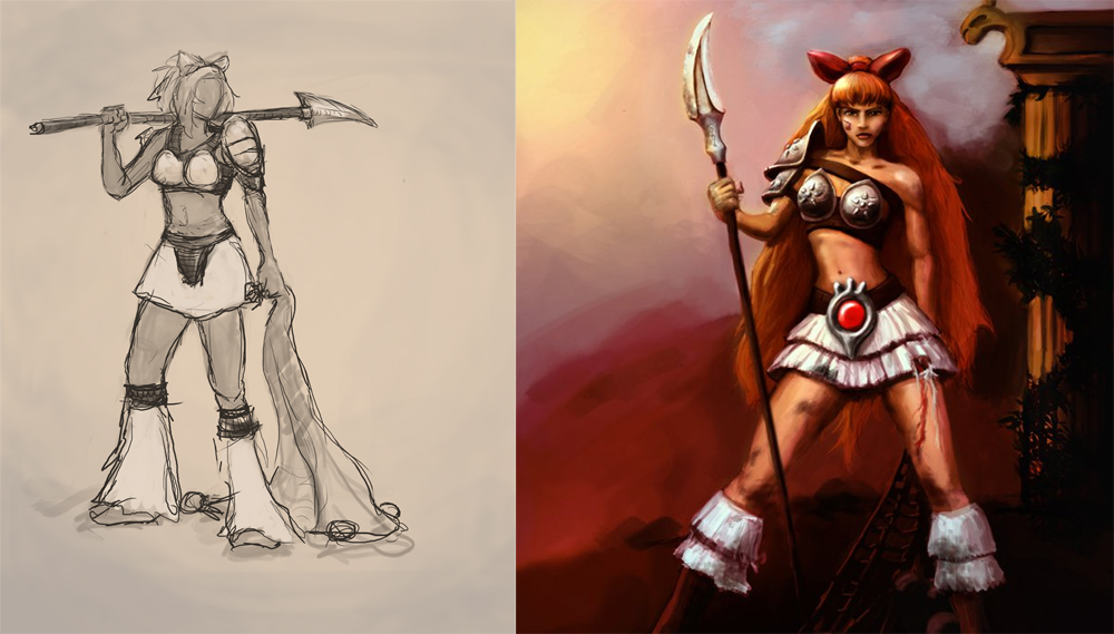 And both versions look pretty cool. I'd be happy with that old one. Lovely vibrant colours, but the pose looks much more natural in the sketch. How long ago was the first one done?