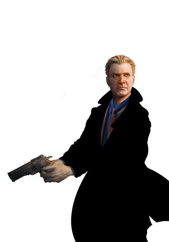 All I did was paint the head (and a portion of the shirt) and the hands and gun. The overcoat was sketched in for form and then just filled in with solid black using the Photoshop fill tool (this will be used as a container for another image).