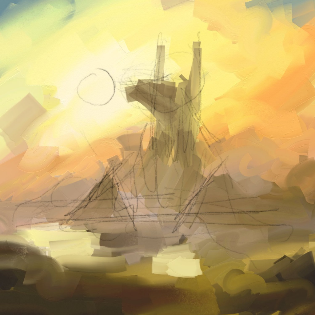 Two vague and unoriginal ideas came to mind. One of a statue god in a dusty indoor scene or a bigger landscape style with an equally bigger god.
