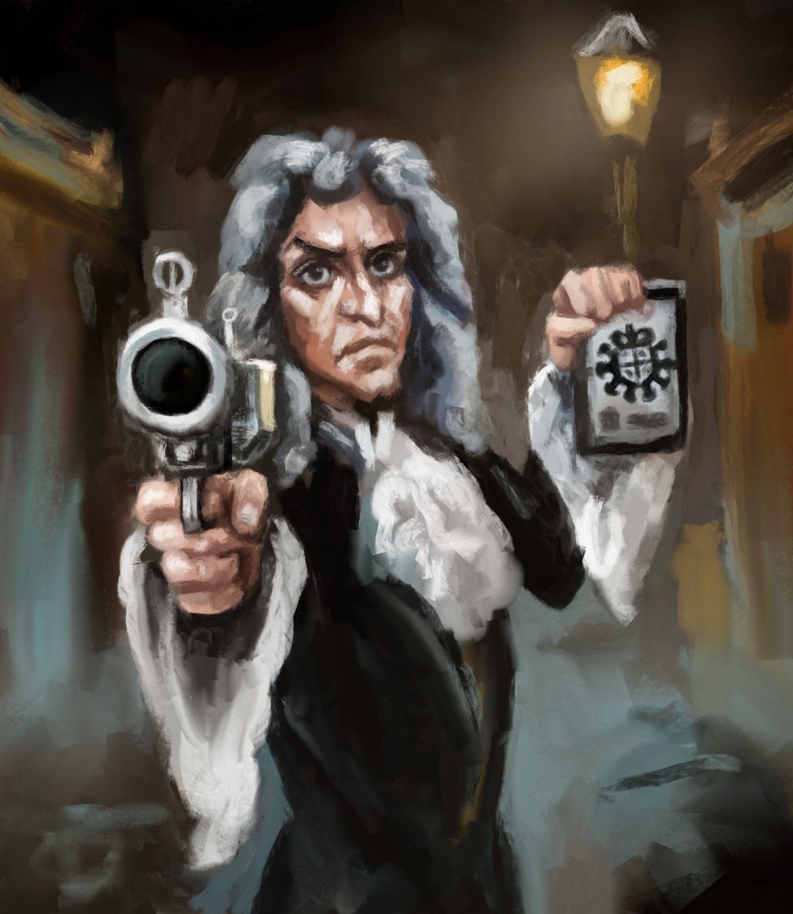 "Special Agent Isaac Newton, Master of The Mint and Officer of the Crown. You, fine sir, are under my arrest for the wilful fraud and gross counterfeiting of Her Majesty's coin and not even the dreadful Leibniz can help you now!"