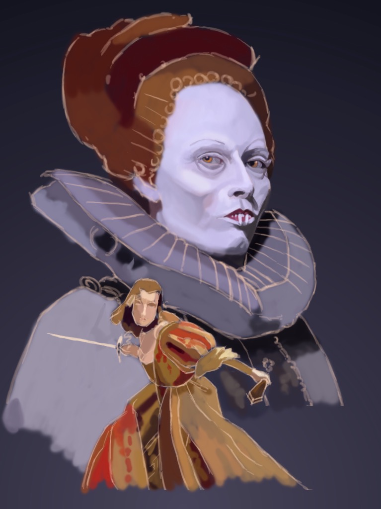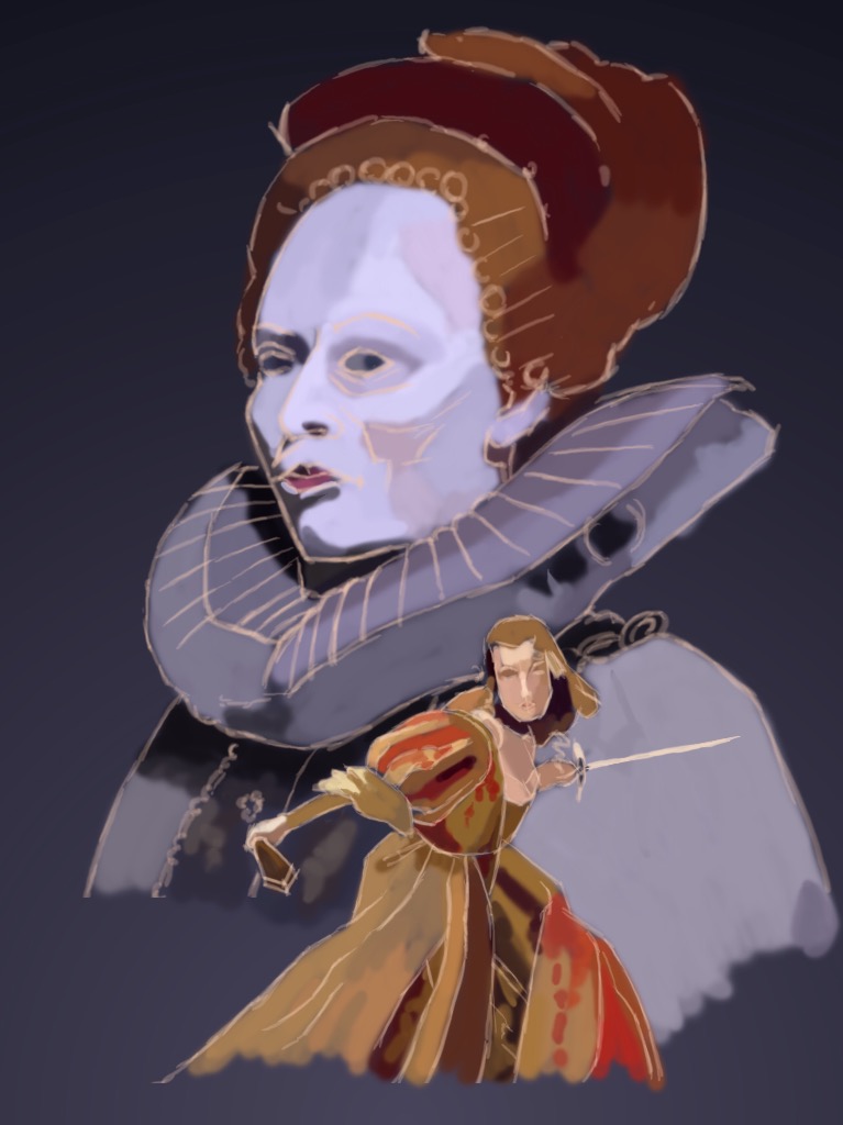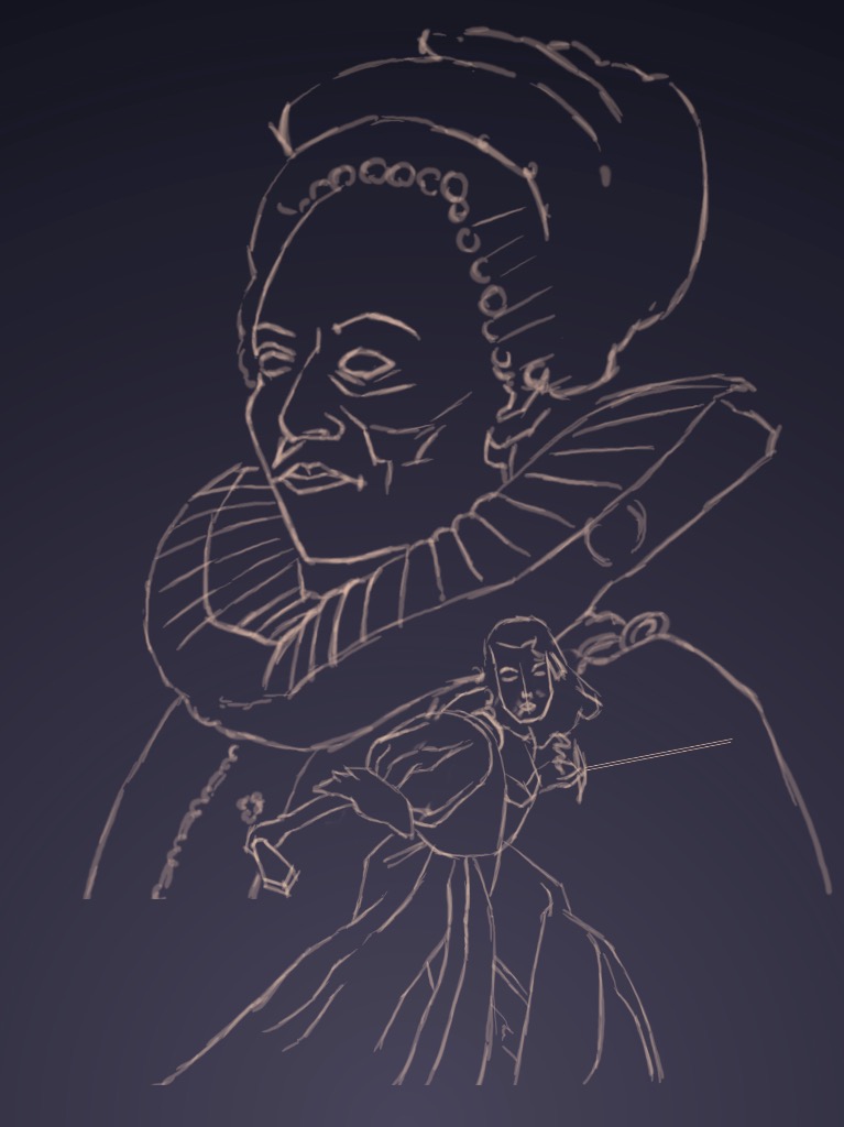 Here’s the rough line drawing and first colours on mine. I’m hoping I can get the two main elements done pretty quickly so I can figure out how to fill this edge spaces in with scenery, secondary character etc kinda like a movie poster.