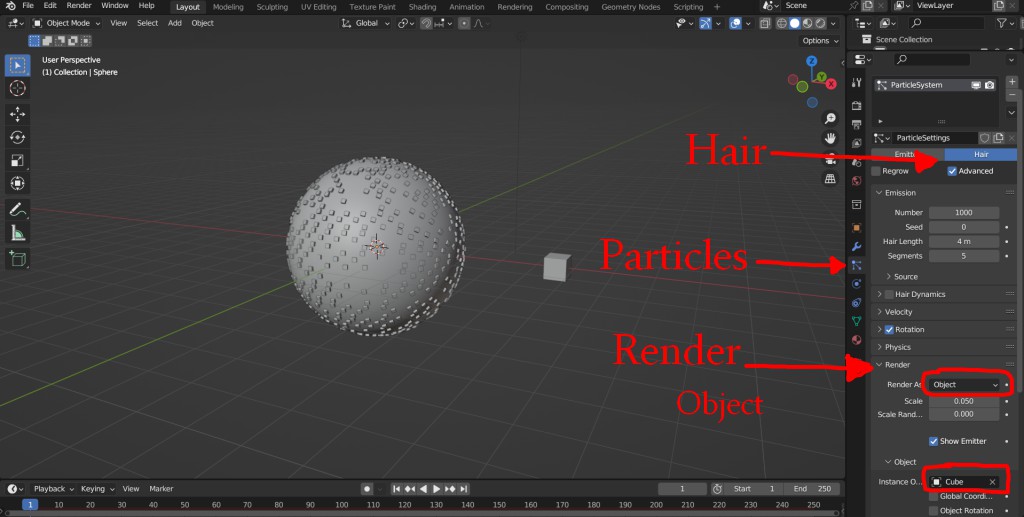 Then go into the Particles tab at the side. Click Hair and Advanced. And further down open up Render and change Render As Path to Render as Object. Then just below select your small object from the list.