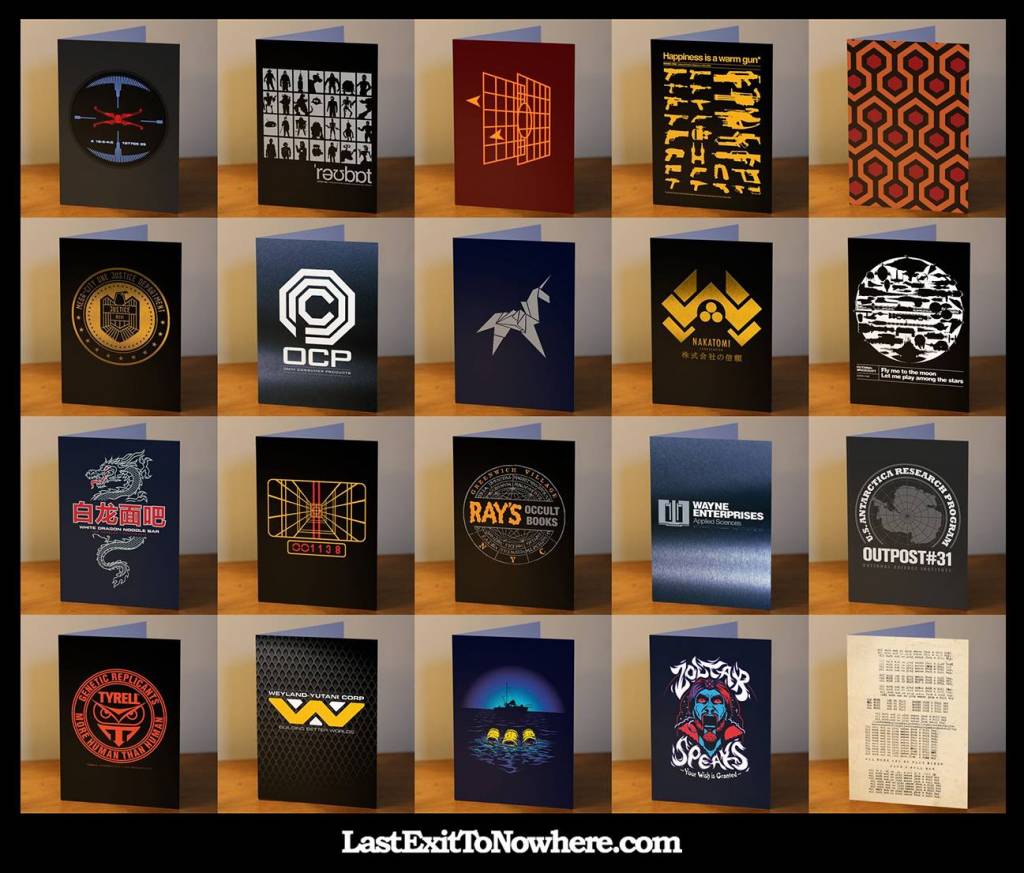 Row 2, 1st is the MC-1 Justice department logo from Dredd, 2nd is Omni Consumer Products from RoboCop, 3rd is the Unicorn from Blade Runner, 4th is Nakatomi Plaza from Die Hard, 5th is a load of space ships from various films.
