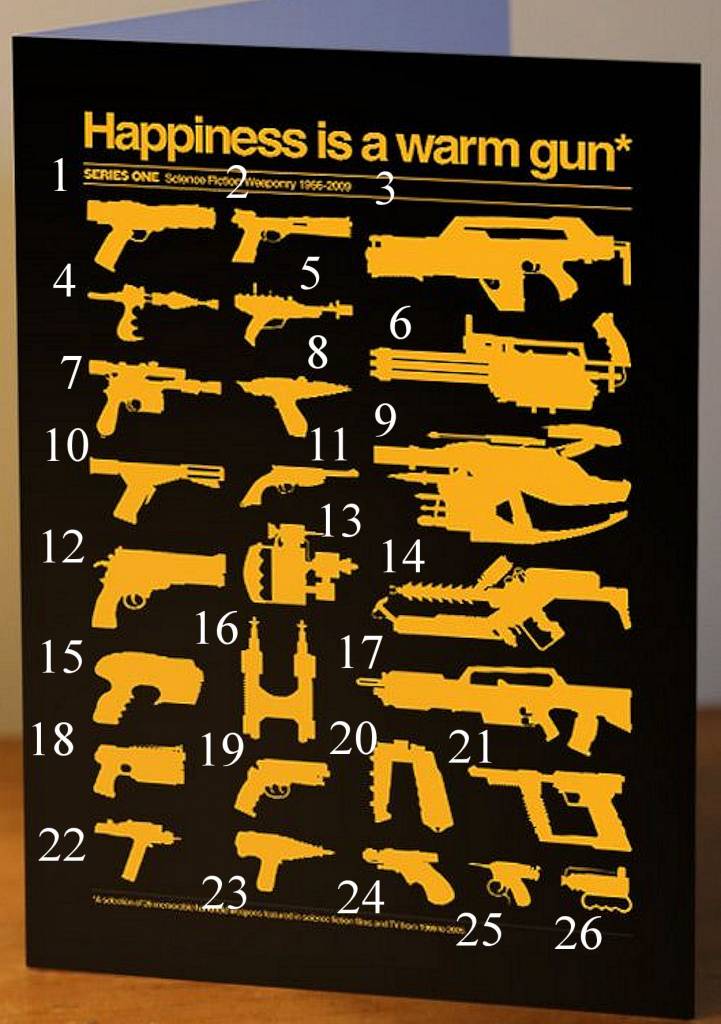 Oddly it's actually the gap between the receiver and the top of the grip that I normally recognize before the dual trigger. I'm a dirty scrub and I Googled to see if I could find the rest. It isn't from care Bears or even Alien, in fact it's not even a flame thrower, it is the gun from District 9. And not only is 16 from The Black Hole, but so is 15. 21 turned out to be the Visitor's gun from V, and valence is correct about the lens flare gun from B5.