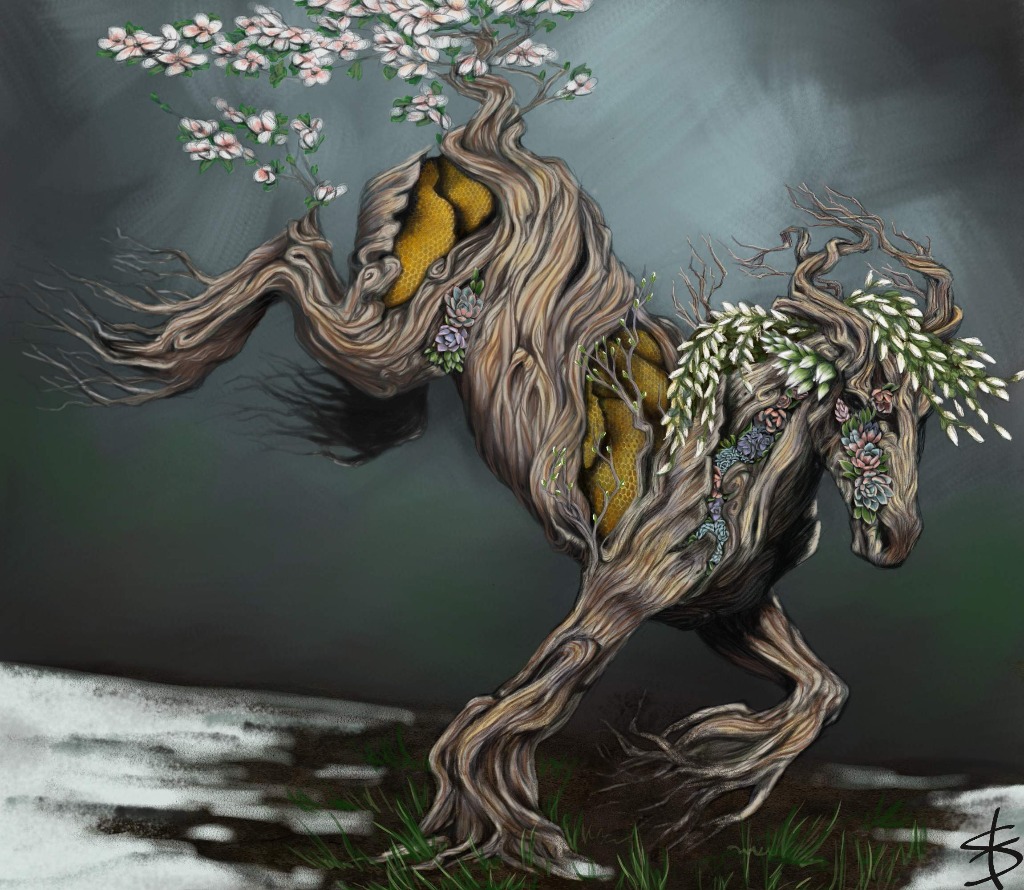 Thomgirl... ah, sigh... always such big plans and always you don't quite pull it off. This work is finished to such a high degree of detail in some areas (nice flowers and bark, btw, really nice *pats self*) but it's clear you got rushed with handling everything outside of this 'Ent-Horse' that it feels a little jarring. I really hope you get some more time finish this out because it's clear you have some big ideas, but haven't gotten to fully realize them. Outside of that, good direction!