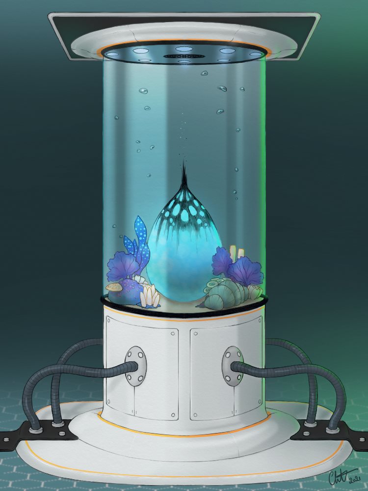 I love the crispness of your image Charlotte and its simple but effective design. The detailing on the fauna within the tank is great and I really dig the patterning on the egg and its little tufty top. The green neon like glow from the right gives the design a nice solidity that I think would be missing without it and the way it picks out the edges of the pipe work is really well done.