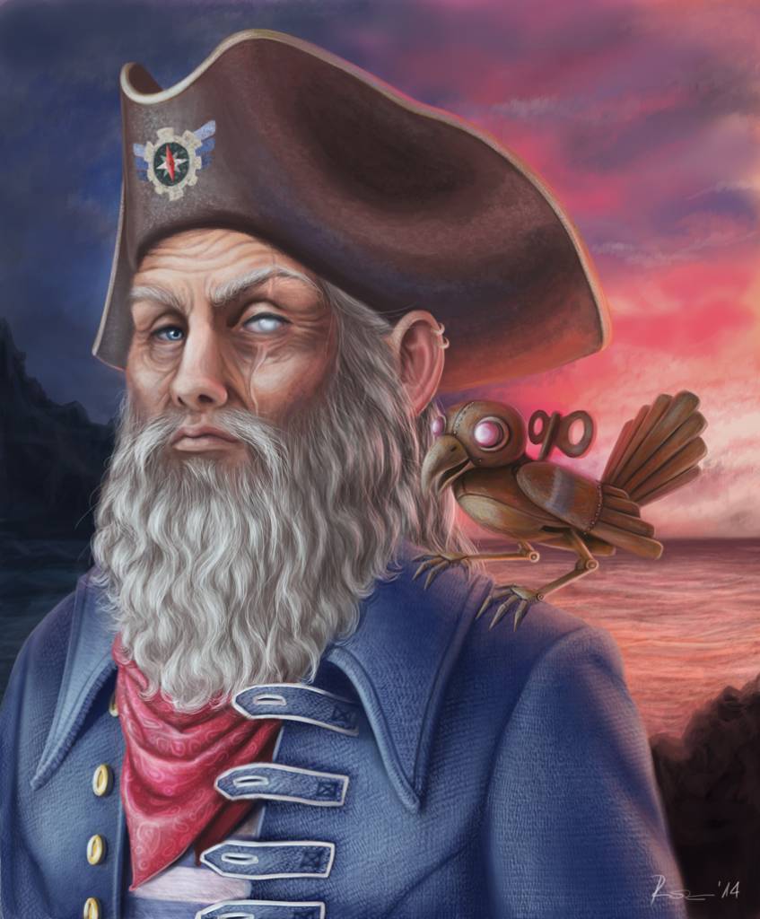 Captain Blindeye is one of the inhabitants of a fantasy world I’m currently developing, and he’s the leader of a group of people that live by the sea. These people have mastered the art of creating machines for whatever purpose you can think of, even flying. The ships they build ply both the air and water around on a daily basis, and this is a huge part of what defines these people in the first place. They’ve even been able to create lifelike robots such as the mechanical bird on Captain Blindeye’s shoulder. These people are not particularly aggressive, but you definitely don’t want to stand in their way when they wander around searching for treasure.