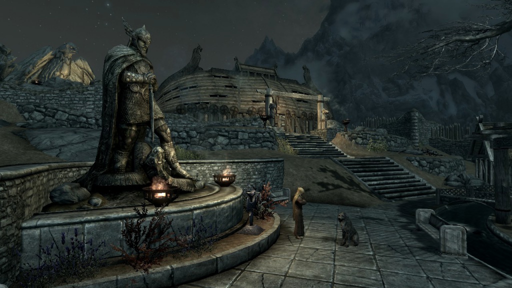 While I was off on this short travel I left my dog behind at Whiterun (MY dog, not that silly talking one that I abandoned) and told him to sit in front of the Talos statue. When I finally got back I found the boring priest Heimskr giving him a sermon!