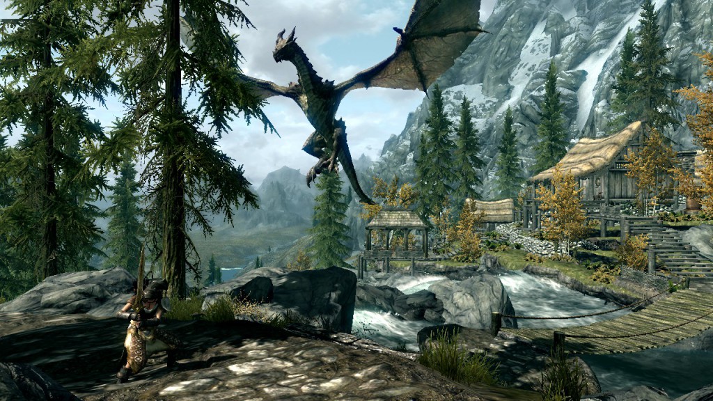 I got out my sword for the fight but because of the lovely balconies, abundance of trees and the equally lovely bridge over the waterfall, the dragon had nowhere to land so it just flew above out of my range while breathing more fire down on me!