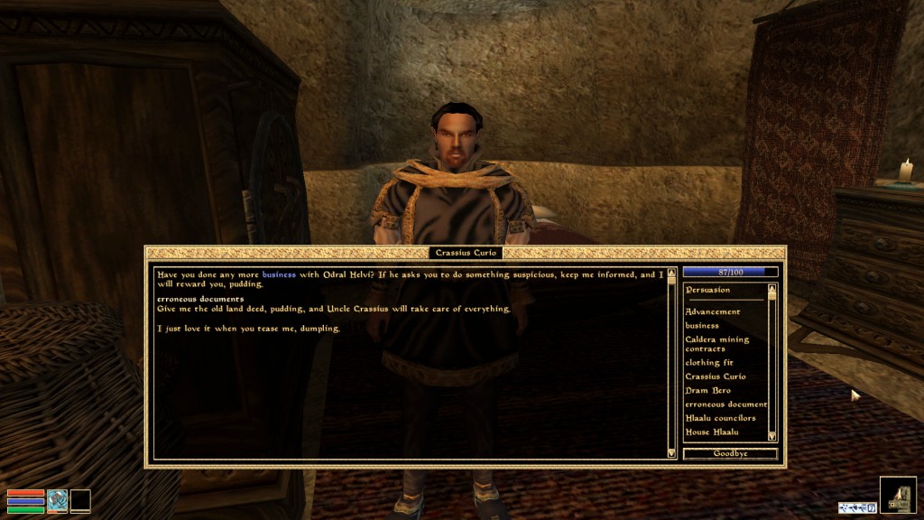 Back with creepy Uncle Crassius in Morrowind *shudder* but at least I get to keep my clothes on now...