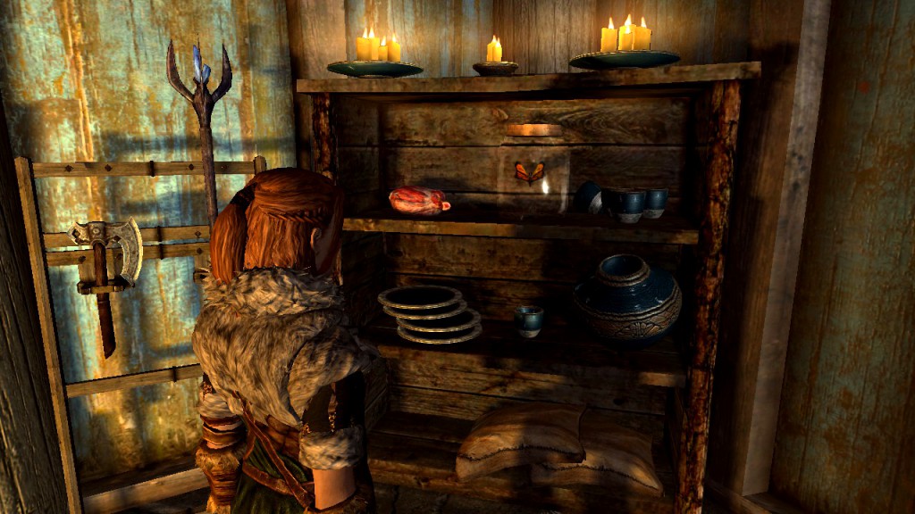 ...before popping inside to do some crafting. I managed to catch one of those nimble snow foxes while bear hunting, so I turned the lovely white pelt into a nice warm-collared vest to stop me from looking so cold on those mountains. Then it was time to go back to Breezehome to try and put my butterfly jar on the shelf...