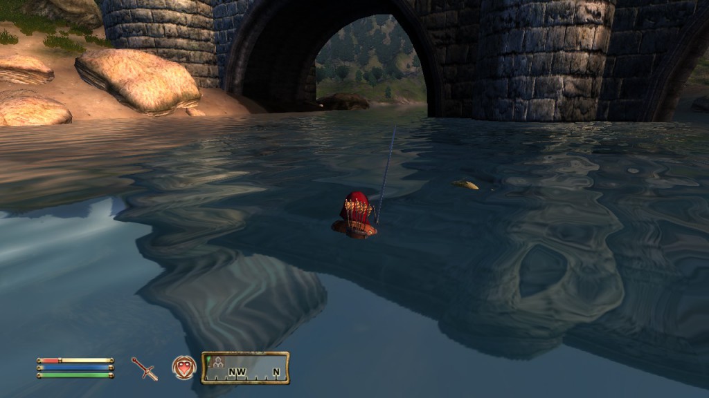 Why the hell didn't he give me that before? Then I would have been able to dive down for more than three seconds so that I could actually see the fish I was trying to kill instead of doing the floaty head, blind sword-splashing stuff like this...