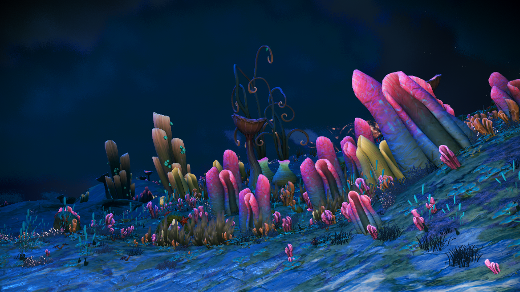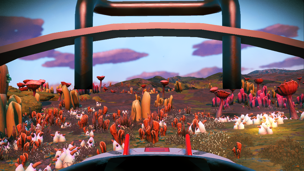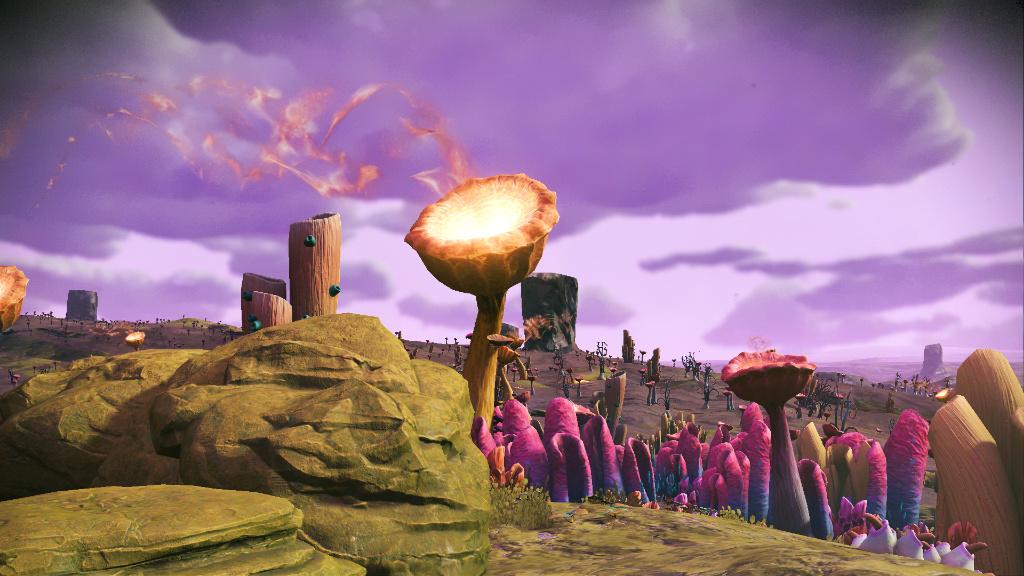 Anyway, I found this planet with colourful mushroom-type flora and blue water (kind of oddly blue since the sky seems to be a pale purple, but still - it's better than orange water!). Sadly the atmosphere is toxic and it's only the second star system I'm visiting so I'm unlikely to ever return. So I took a bunch of screenies to remember it by