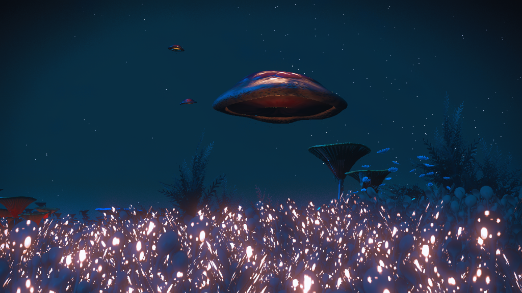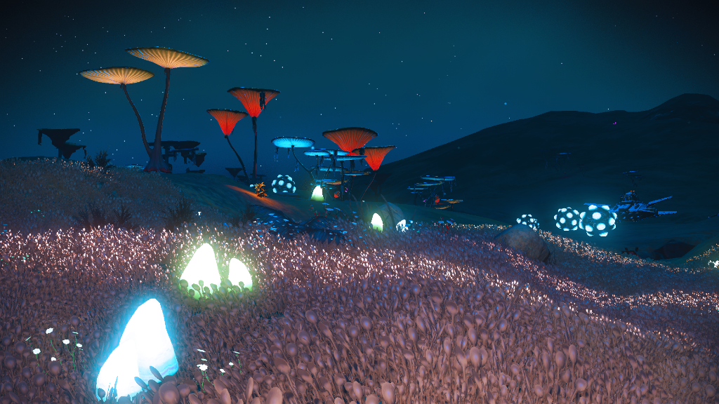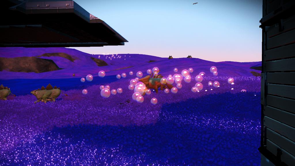 The lovely green grass is now bright purple. The fauna has been exchanged. There are bubbles everywhere, even inside the buildings! And there was something like an earthquake or something while I was walking around. Or maybe I had one of those exploding plants right under the floor... Anyway it was noisy and the whole place shook... It's a little sad to think I can spend a week looking for a nice planet to build a base and then.... it changes....