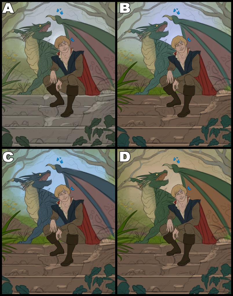 I think D has the best colour harmony but, as with the previous one, you'll have to be careful to maintain that edge at the top of the head with so many similar hues.