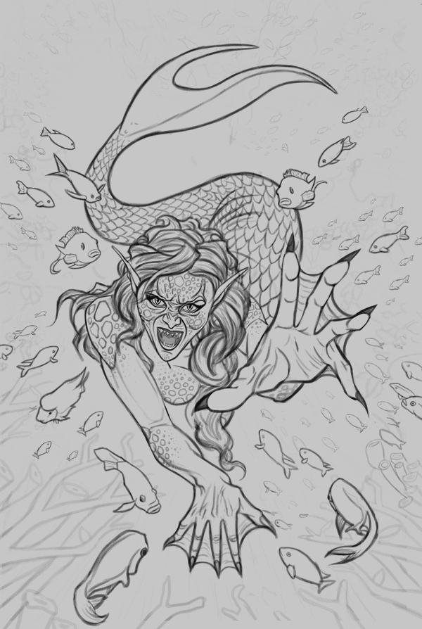 ............ It's May which can only mean one thing... MerMay! I think I've made it a yearly theme to illustrate on during this month. I decided to go with more of a creature than a radiational beautiful mermaid as I feel that's overdone, plus I wanted to challenge myself with something a bit different than I usually paint. For reference, I tried to capture the general pose of this photo from The Pose Archives, and I feel I was quite successful in that regard. Spent a lot of time on the sketch bringing it to life and coming up with an interesting composition. I have a very strong idea for the color palette as well so I probably won't do a series of color tests for this one. But before I begin the painting process I would love to hear any input on the sketch as I'd like to get that right as much as I can before beginning coloring work, so any feedback would be quite appreciated!