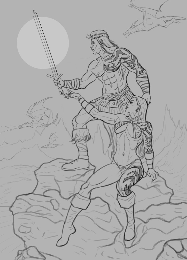 Time for a new illustration! I'm in the mood to paint something Boris Vallejo-ish as I haven't done that in quite a while, so I created a sketch based on some figures from Grafit Studio. Pretty pleased with how the sketch turned out overall, and I think I'll begin work on some color tests soon... but until then please feel free to let me know any input as I prefer doing corrections early in the process, just makes the painting process easier for me and can save a lot of time! Below is the current sketch: