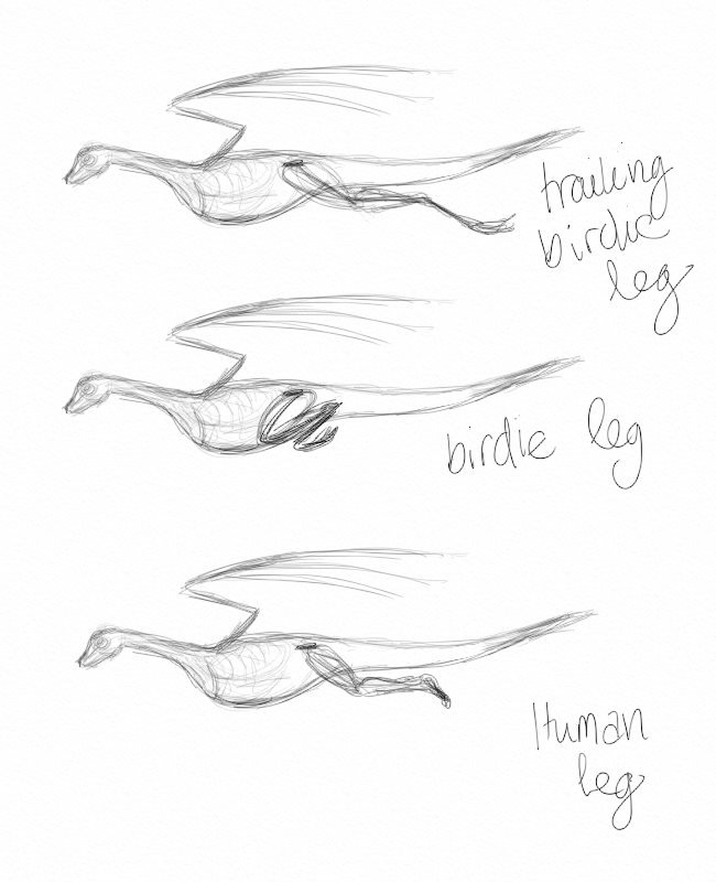 But basically, birds can trail their legs behind when flying, but most of them will retract them under their body in flight. So basically I wouldn't expect three dragons flying about, all having their legs in the trailing position. And then human and bird legs have different proportions. For instance, at least the feet part of birds are basically just skin, bone and tendons. So I wouldn't expect a dragon's legs to be particularly fleshy, either. I made a little sketch, trying to illustrate this: