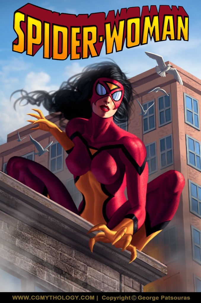 For Spiderwoman I'm not entirely convinced by the placement of her right leg (to our left). It looks kind of like it centers/originates on the groin rather than her hip area... The arm that reaches for us might also need to grow a bit wider as it gets closer. As it is, it looks fairly slim all the way in spite of the size of the hand. (But that is always tricky to get right as the lower arm should be slimmer than the upper and that might negate the foreshortening effect a bit...)