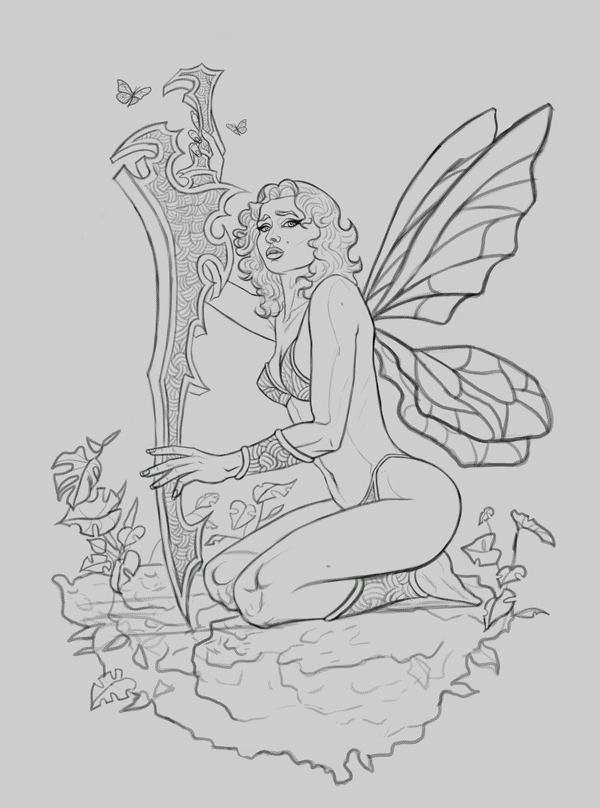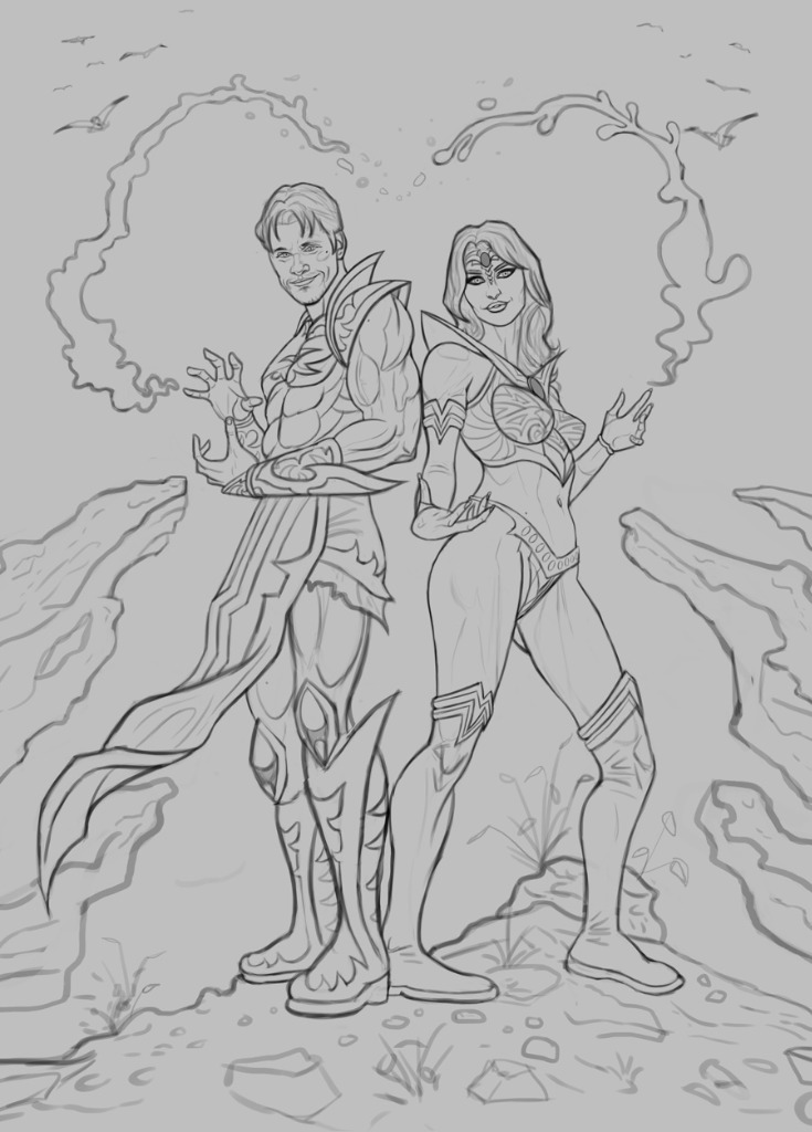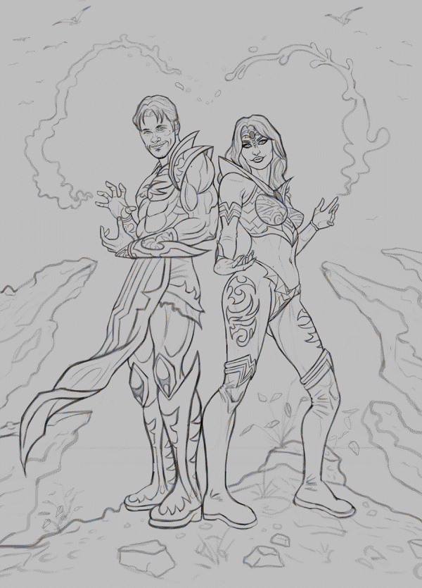 For the poses I had a reference from Satine Zillah that I bought from ArtStation that I did my best to recreate while coming up with my own original character designs. You can see in the sketch I've included some magical powers forming a 'heart' - I didn't want this to be too blatant, for an easter egg but I feel it work well compositionally.
