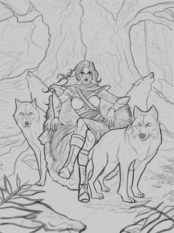 I'm not entirely convinced by the shape of the front wolf's body though. I didn't notice before, guess it wasn't as noticeable before the colouring. If you do make adjustments, take a second look at it and in particular the silhouette, I think. It kind of reads as a strange shape, to me.